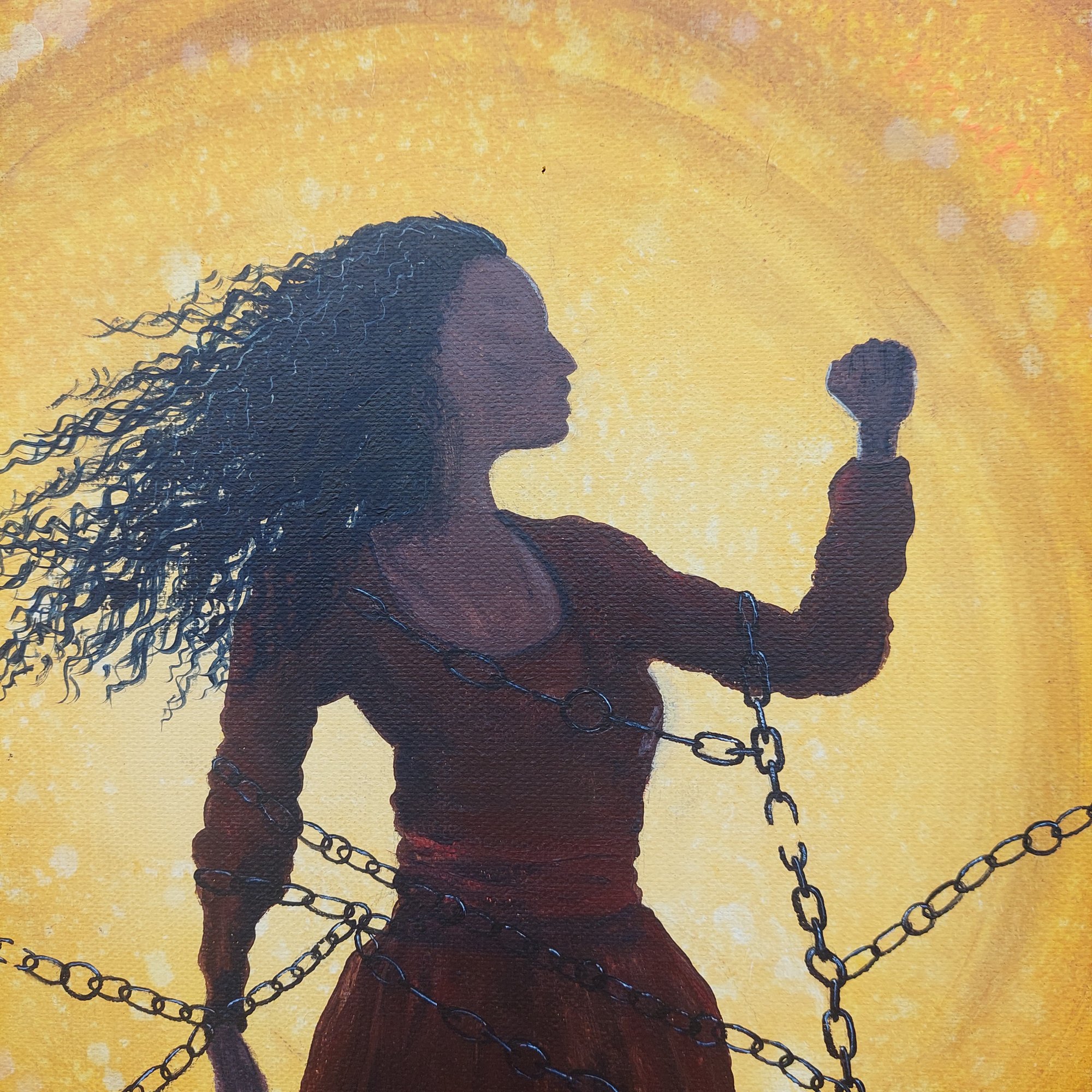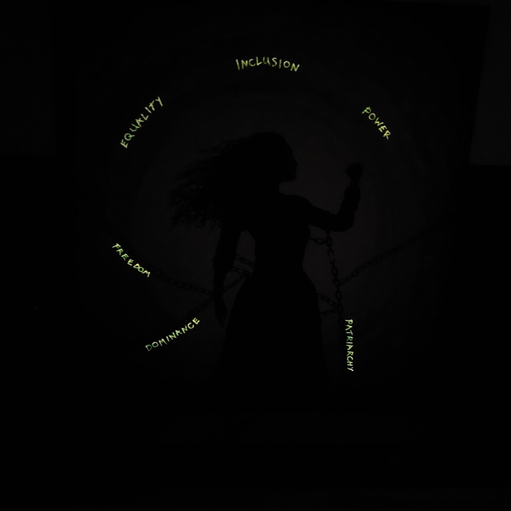 It's the moment of breaking free, of shattering the chains that once bound. Along the broken links in UV paint, are the words freedom and patriarchy, symbols of old systems beginning to fracture. Yet one chain remains unbroken, bearing the word dominance, a reminder that while progress has been made, the work is far from finished.