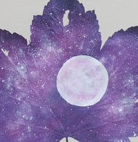 The moon shimmers against a velvety purple sky as a sprinkle of stars light up the sky. Lovingly painted in acrylic on a real, preserved sycamore leaf.