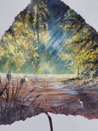 The morning sun casts a golden glow over a still and tranquil lake in this praceful scene. Lovingly painted in acrylic on a real, preserved silver birch leaf.